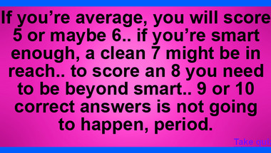 7/10 is the score to beat in this trivia quiz to put yourself over the average quiz taker. But you're probably going to be able to answer questions "Kilimanjaro, Ben Nevis and Everest are all examples of which geographical feature?" and "Who sang this song around 1979 : "Hopelessly Devoted to You"?" easy!