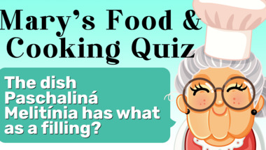 Look forward to questions like "The dish Paschaliná Melitínia has what as a filling?" and "The indian utensil called an ammikal is a mortar and what?"